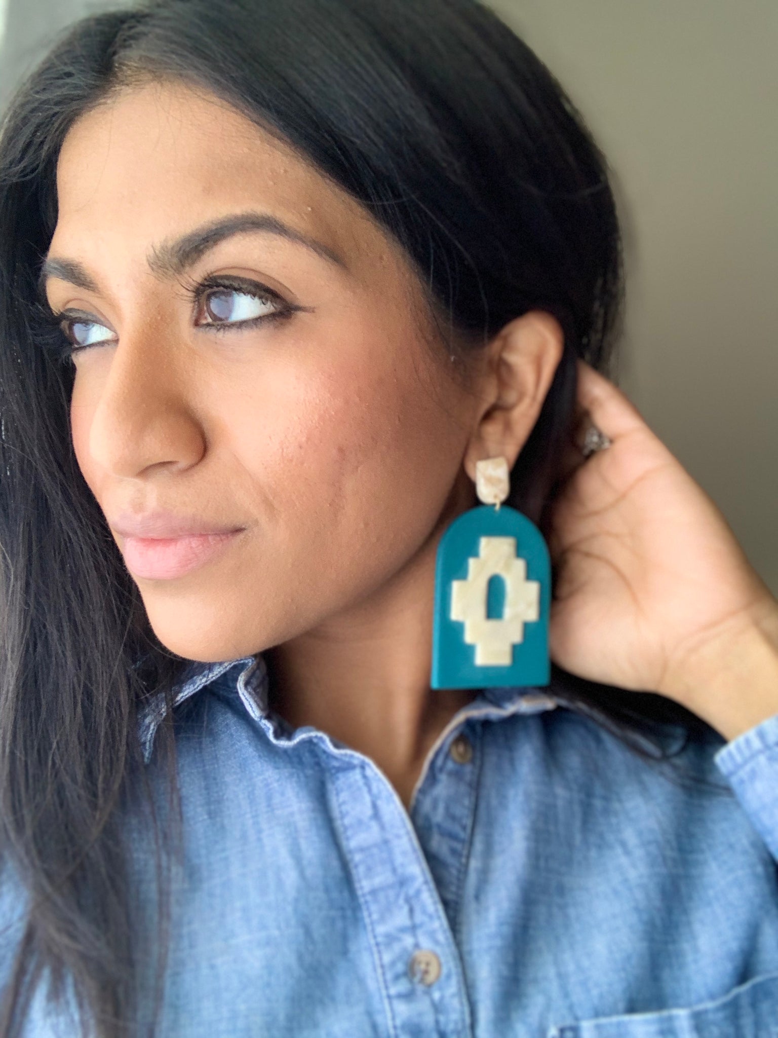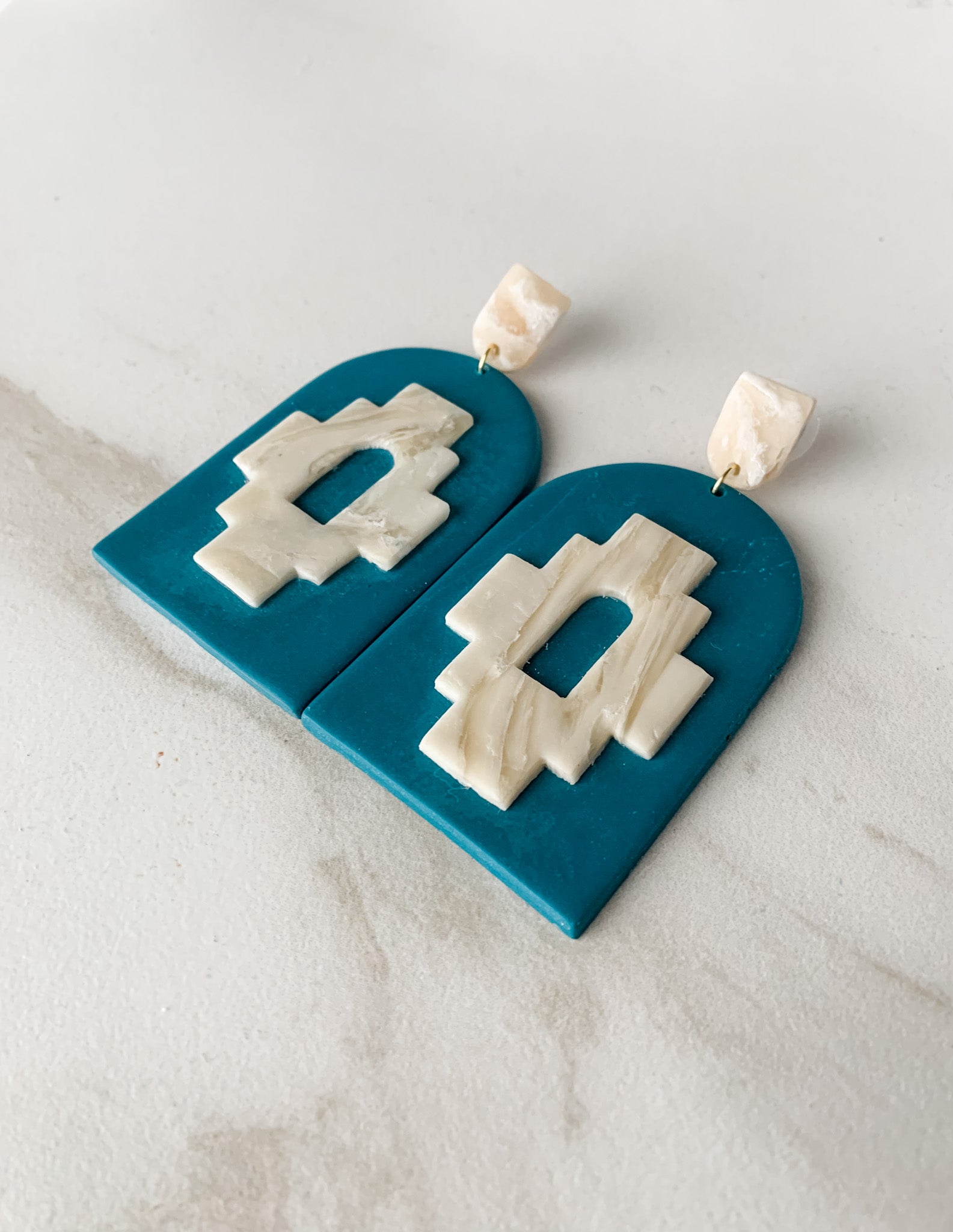 A stunning piece featuring rich jewel tone of teal against a grounding neutral centerpiece. It is a show stopper for sure.
